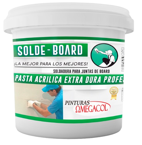 Aplique una capa de SOLDE-BOARD con espátula en las uniones de las placas, sin dejar secar, siente la cinta y retire el exceso deje secar por unos 30 min. Aplique una segunda mano con una espátula más ancha que la anterior cubriendo la cinta, retire excesos y deje secar por 24 horas para el acabado final use masilla acrílica MEGA MASTICK ΩMEGACOL.